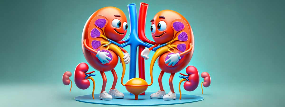 Kidneys are located behind your belly, just below your ribcage, two bean-shaped organs about the size of a fist, with an approximate weight of 100-200 grams each, depending on gender and side. They constantly produce urine collected in the bladder before, at around 350ml, we feel the urge to eliminate. Kidneys form, with the ureters, the renal pelvis, the bladder, and the urethra, our body’s so-called urinary system.